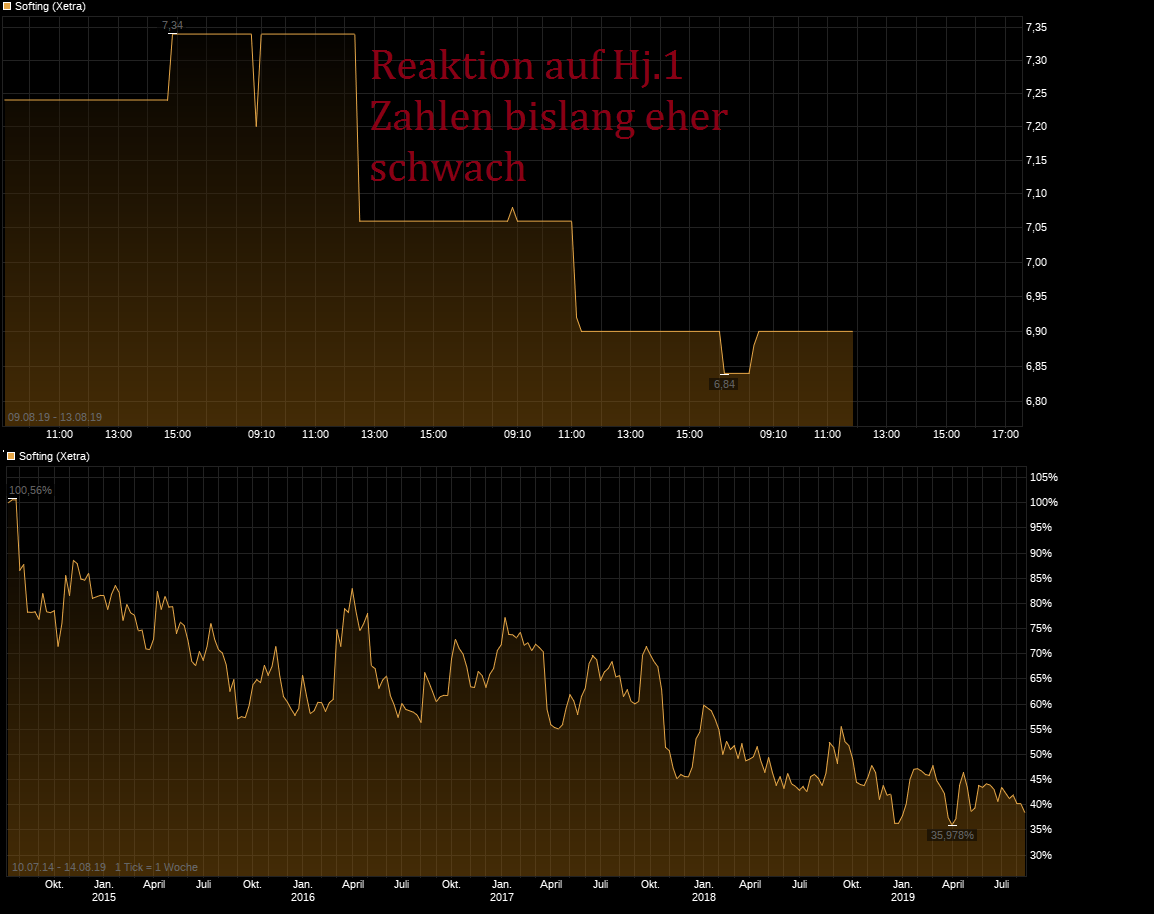 Wichtig ist immer nicht alleine absolute Zahlen zu vergleichen, sondern die Zahlen pro Aktie anzuschauen. Da die explosive Aktienvermehrung bei Softing seit Jahren anhält (1.Hj.2016: 6,95 Mio , 1.Hj.2018 : 8,4 Mio, 1. Hj.2019: 9,11 Mio), ist es irreführend nur absolute Zahlen zu vergleichen. Bezogen auf den Wert pro Aktie bei Gewinn ist kaum ein Unterschied zur Vorjahresperiode zu erkennen und der Anstieg in 2019 ist in erster Linie nur der Änderung der Bilanzierungsvorschrift IFRS16 geschuldet. Von daher ist die Bewertung weiterhin sehr hoch. Ein größerer Teil des Umsatzanstiegs ist durch Globalmatrix erzeugt, der aber Verluste bringt. Von daher ist ein großer Teil der Umsatzuwächse bislang nicht hilfreich für den Gewinn pro Aktie. In den USA hat man einen in Euro ausgedrückten Umsatzrückgang, trotz zunehmender Stärke des Dollars. Scheinbar läuft OLDI weiter nicht so richtig rund. In der Sparte Automotiv ist der Umsatz gegenüber dem Hj.1 18 um satte 3,7 Mio gesunken. auf nurnoch 5 Mio.€ . Scheint also auch leider weiter die große Problemsparte von Softing zu bleiben, obwohl Trier in 2018 vollmundig so eine tolle Entwicklungen für den Bereich in 2019 versprochen hatte. Na ja, so kennt man ja den Trier. Somit scheinen nur extern zugekaufte Dinge wie die zuletzt sehr kostspielig erworbene Globalmatrix hier umsatzseitig Wachstum zu bringen ( wenn auch bislang weiter ohne Gewinn) und das organische Wachstum beim "Altgeschäft" weiter mau zu bleiben. Auch der Anstieg der Minderheitenanteile sollte beachtet werden. Die sind gegenüber dem Hj.1 18 um ca. 0,2 Mio angestiegen und müssen abgezogen werden. Entsprechendes fehlt aber noch z.B. wenn man nur vorgelagerte Kennzahlen wie EBIT oder EBITDA anschaut, wo viele Dinge hinterher noch abgezogen werden müssen bis wirklich der echte relevante Gewinn übrigbleibt. Kurzfristige Schulden sind gegenüber dem Hj.1 18 um 3 Mio.€ gestiegen, langfristige Schulden um 0,5 Mio.€ gesunken. Somit auch bei der Gesamtverschuldung ein weiterer Anstieg. Wenn ich auf den Chart schaue, dann ist die Reaktion auf die Zahlen eher schwach. Da kann man nur hoffen, daß im 2.Hj. deutlich mehr Gas wieder gegeben wird und man mal DEUTLICHE Verbesserung beim Gewinn pro Aktie sehen wird. Und zwar nach Abzug aller echten Belastungen.