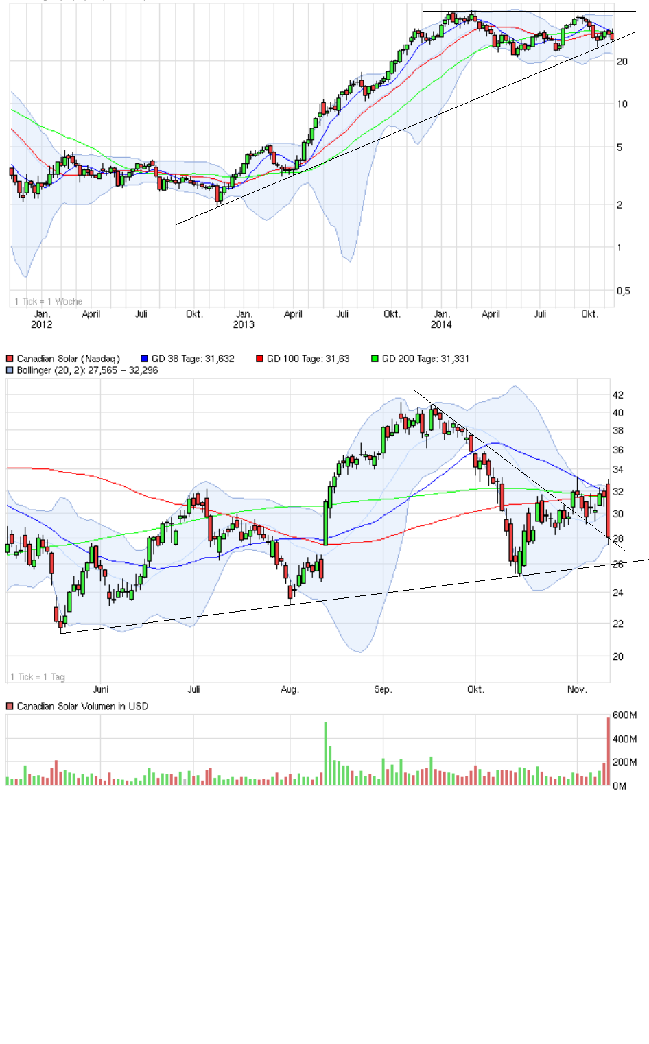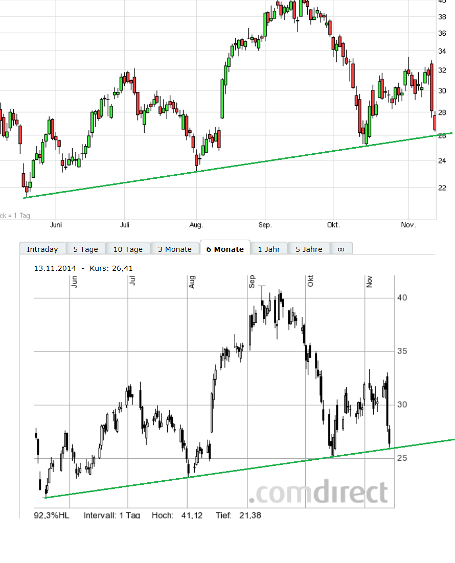 also aus charttechnischr sicht war der erneute abprall an dem Gemenge der GD 100, 200 und 38 sicherlich nicht ideal. andererseits befinden wir und noch knapp oberhalb der beiden Aufwärtstrendlinien und am uBB (im Tageskerzen). die Abwärtstrendlinie von Mitte September wurde schon durchbrochen. Eventuell könnte der derzeitige Kurs als nochmaliges Testen dieser Linie zählen. Bei 26 $ ist nochmal die Unterstützung der Trendlinie Mai-August- Oktober. Bei 25$ das von Mitte Oktober.