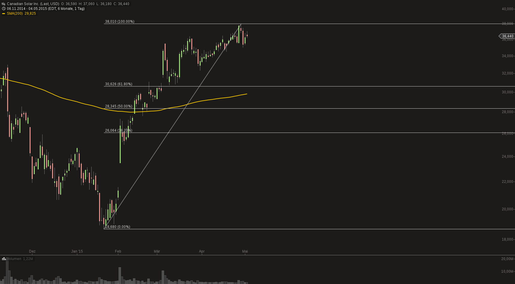 Für Canadian: sollte auch hier in den kommenden Wochen kein Anstieg (Schlusskurs) über das Hoch von 38USD erfolgen, erhöht sich die Wahrscheinlichkeit einer Korrektur enorm. Q1 wird auch hier im Vergleich zum Vorjahr vermutlich sehr gut....aber saisonal ist natürlich auch hier mit einem schwächeren ersten Quartal zu rechnen (auf Jahressicht). Die Handelsvolumen sind trotz permanent guter News schwach, die Kurse reagieren auf den Newsflow auch kaum noch...ich gehe auch hier davon aus, dass wir über den Sommer mindest im Fibo_level bis auf 61,2% korriegieren. Ziel wäre dann 30USD. Falls dieses Szenario eintrifft, würde ich hier eine erste Position bei CASO eröffnen. Falls sogar bis Fibo 50% korrigiert wird (eher unwahrscheinlich) würde ich meine Posi deutlich erhöhen!