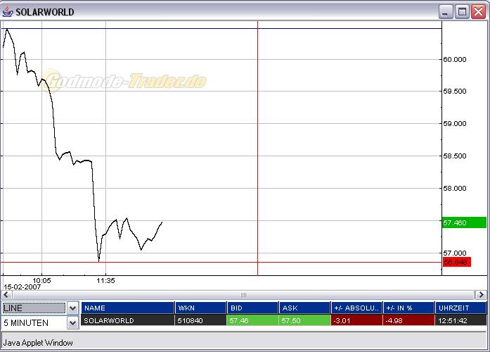Rückblick: Die SOLARWOLRD Aktie brach am 15.01.2007 über den Widerstand bei 50,85 Euro nach oben aus. Danach kam es zu einer steilen Aufwärtsbewegung bis 67,75 Euro. Dieses Hoch erreichte die Aktie am 06.02.2006. Seitdem konsolidiert die Aktie, wobei die Unterstützung durch das letzte kleine Zwischenhoch bei 59,50 Euro als Unterstützung dient.