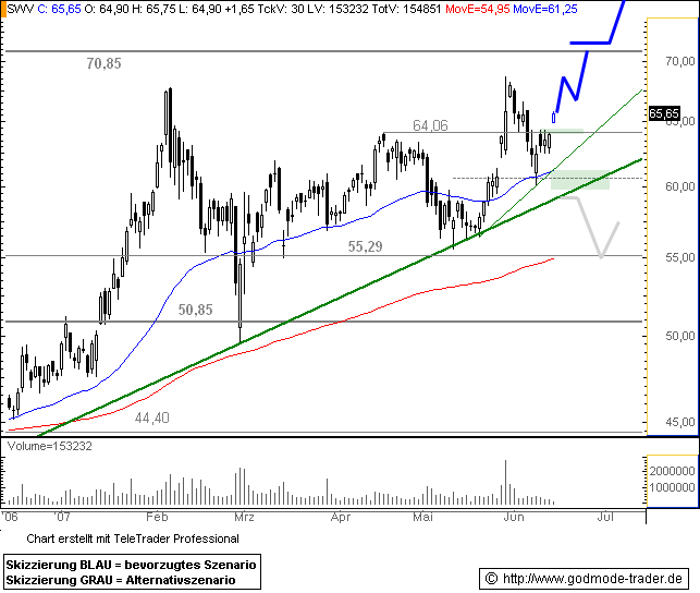 (by the way: M.e. geht sie nicht seitwärts ode rrunter. Außer gesamtmarkt sollte crashen". Wir sehn im Juni noch die 75 Euro. Ob dann sommerflaute -seitwärts- kommt weiß ich nicht.Es wird aber im Juli Prognoseanhebung und Sonderertrag USA-Zukäufe geben....Bin definitiv bullish...+ bald, schon balsd geht die Post ab. Die "Großen" kaufen derzweit massiv die aktien der zittrigen Kleinanleger. Da serzählen Broker + Investor relations bei SW. Da Namensakktien , haben sie den Überblick. Es sieht so aus als kommt bald der Startschuss für die Solarworld -einzelrallye OHNE andere Solarwerte+Conergy wird nie nominal den SW Kurs erreichen . Q-Cells auch nicht. Ohne Split natürlich!)