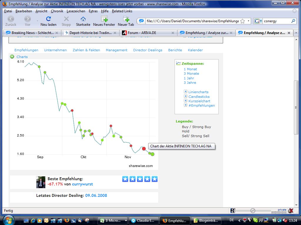 Da hab ich auf meinem Depot 25998,00 Euro liegen, und freue mich riesig, denke, das kann nicht sein, oder doch? Doch, da steht "Augeführt"! Ohmann, fein, ich schreie, jubel, und kann eskaum fassen. Kein Anruf der Citibank, ich rufe also slbst an, O-Ton der Bank: "Es kann sich hier um einen Mißtrade handeln, aber da bekommenSie auf jeden Fall einen Anruf morgen!". Ich kann die Nacht kaum schlafen, kann mich auf meiner Arbeit kaum konzentrieren, immer den Hintergedanken im Kopf: Ist das wirklich wahr? Oder nicht? DenganzenTag kein Anruf der Bank, nachmittags komme ich nach Hause, und meine Order sind nicht mehr da, wie vom Teufel verschluckt, keine Spur mehr von meinem 102 Euro-Trade. Ich rufe erneut bei der Bank an: "Ja es wurde alles annuliert, da muss sich der Trader auf dem Parkett mit dem Komma vertan haben...." Diese Aussage reicht mir nicht, ich rufe in Frankfurt bei der Börse an, nach 3 Anrufen mit mir falsch mitgetilten Nummern endlich eine unfreundliche Frrau, die auch zunächst meinte ich sei bei ihr falsch und müsse mich an meine Bank wenden, nach langem Gerede versprach sie einen Rückruf, der tatsächlich auch kurz darauf erfolgte, "Ja, der Händler habe sich vertan, und der Händler habe das Recht, seine Trades annulieren zu lassen, es handele sich hier aber nicht um einen Mißtrade, sondern um eine "Preiskorrektur! Waaaaaaaaaaaas ? Eine PREISKORREKTUR? Leichte Korrektur um 101 Euro, sonst nichts? Warum habe ich dann nicht schlafen lkönnen, und war so aufgeregt um das Ganze???