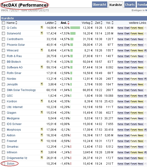 Die guten Zahlen der US-Konkurrenten und die neuen Großprojekte schieben die Kurse der Solarfirmen an, die zuletzt etwas nachgegeben hatten. Q-Cells und Solon steigen um fast vier Prozent. Auch Solarworld und Conergy befinden sich unter den Top-Gewinnern im TecDax.