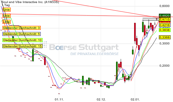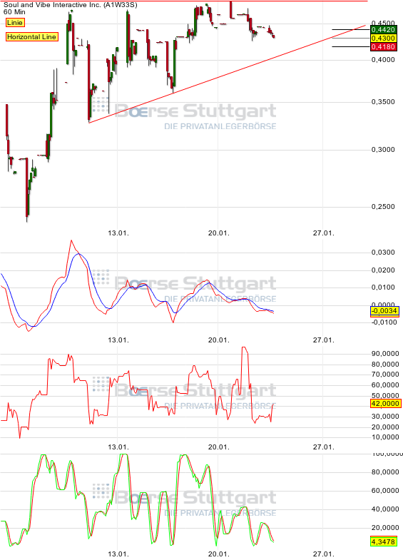 muss ich hinzufügen, dass der Chart in einem Trendwechsel vollzieht, auch die Indikatoren haben sich nachteilig entwickelt, deshalb wäre meine persönliche Meinung, die Aufgabe einer Stop-Limit-Order erforderlich um noch Gewinne mitnehmen können. Dieser plötzlicher Trendwechsel hat mich überrascht, vor allem mit einem recht geringen Volumen, das war ein Versuch, die anderen Anleger auszustoppen, jedoch ist es nicht mehr vorherzusehen, welche Richtung nun sich der Kurs entwickelt, heute wird es sich zeigen, aber ich denke die geheimnisvollen Akteure werden den Kursverlust von gestern, heute wieder gut machen. Was aufällt ist die Tandsache, dass der Kurs kurz vor dem letzten Widerstand aufgefangen wurde, weil der nächste Widerstand wäre der letzte Tiefpunkt gewesen (0,27-0,31€), dass sieht nach einem System aus, aber die Intention der Akteure ist geheimnisvoll, heute wird es spannend!