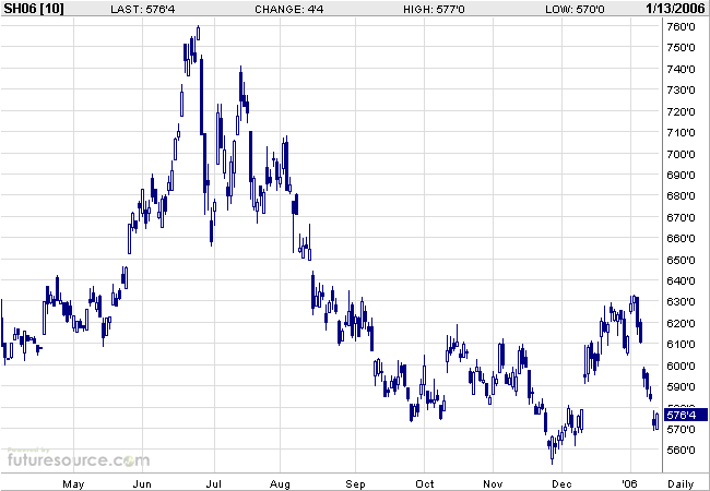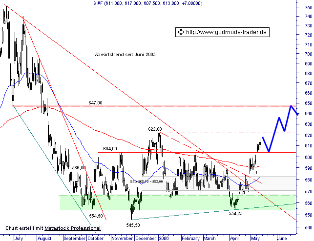 Diagnose: Der Future auf Sojabohnen im adjustierten Endloskontrakt fiel im Januar 2006 unter die wichtige 599,50er Unterstützung und aktivierte mit diesem Kursrücksetzer das alternative Szenario. Im Zuge der Abwärtsbewegung wurde das aufgerissene Gap (Kurslücke) zwischen 568,75 - 582,00 US-Cent/bushel geschlossen. Seit dem letzten Bewegungstief bei 545,50 US-Cent/bushel formiert sich ein moderat ansteigender Aufwärtstrend, der aktuell bei 565,00 US-Cent/bushel verläuft.