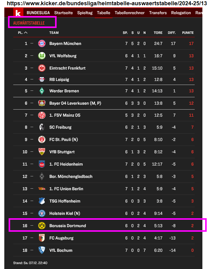 Platz 16 in der Auswärtstabelle. Punktgleich mit Platz 17.