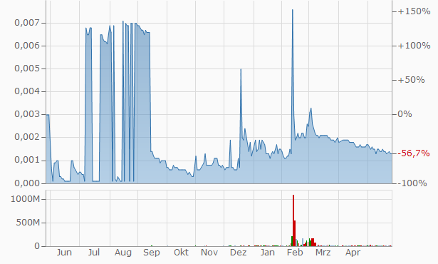 Also das Teil kennt ja, seit ich vor einigen Monaten meinen ersten Kauf für 0,0022 Euro getätigt habe, wirklich nur eine Richtung. Sowas "konstantes" (leider im negativen Sinn) hab ich auch noch nicht erlebt. Ging nie wirklich hoch, nur bergab. Heute nur noch 0,0013 Euro im Kauf... Und offenbar kein Ende in Sicht. Aber verkaufen rentiert sich jetzt auch nicht mehr. Na dann schau ich halt weiter meiner Kohle zu, wie sie weniger wird. Isch doch richtig, oder ? (Grüße an meinen Leidensgenossen Noenough). Aber da hier auch schon ein mögliches Reverse Split ins Gespräch gebracht wurde: darüber müßten aber erst mal die Aktionäre abstimmen,soviel ich weiß. Geht also nicht so ohne weiteres. Und ob die bei dem katastrophalen Kursverlauf wirklich zustimmen würden ? Naja, mal abwarten.