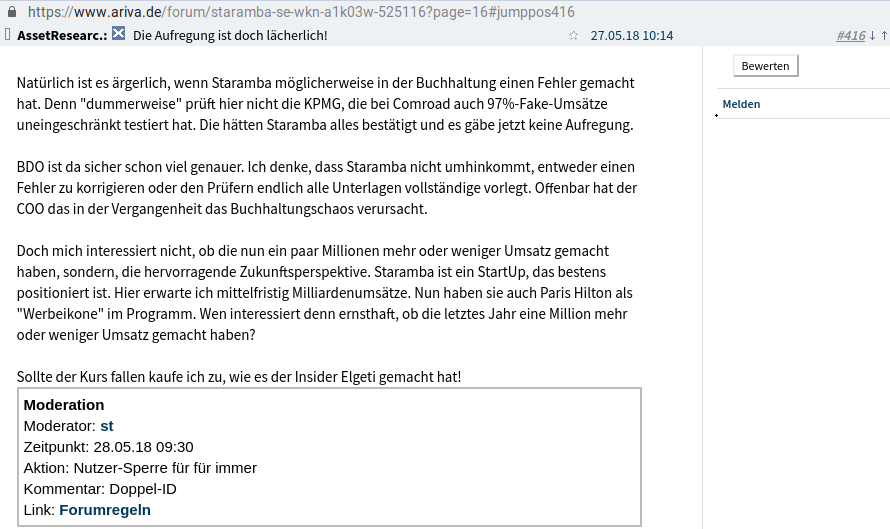 Der Fehler im Abschluss 2018 schlug meines Erachtens dann allerdings dem "Fass den Boden aus". "Coin-Verkäufe als Umsätze zu buchen ist bei dem Geschäftsmodell von Staramba wohl "völliger bullshit".