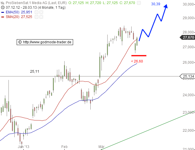 Kurse über den gleitenden Durchschnitten und erst in der letzten Woche ein neues Hoch bescheinigen der ProSiebenSat1 Aktie weiterhin einen intakten Aufwärtstrend. Dieser kam im März jedoch insofern zum Erliegen, als dass die Kurse kurzfristig in eine Konsolidierung übergingen. Charttechnisch besteht dabei sehr viel Spielraum für Korrekturen, ohne den mittelfristigen Bullenmarkt direkt zu gefährden. Ein jetziger Rutsch unter 26,60 Euro aber könnte eine Korrekturausdehnung mit sich bringen. Solange dieses Verkaufssignal ausbleibt, sind weitere Gewinne bis auf 29,00 Euro in den nächsten Tagen und später 30,39 Euro möglich.