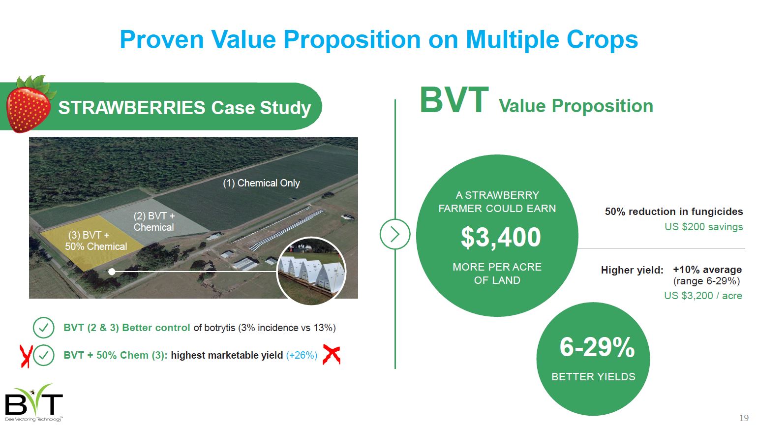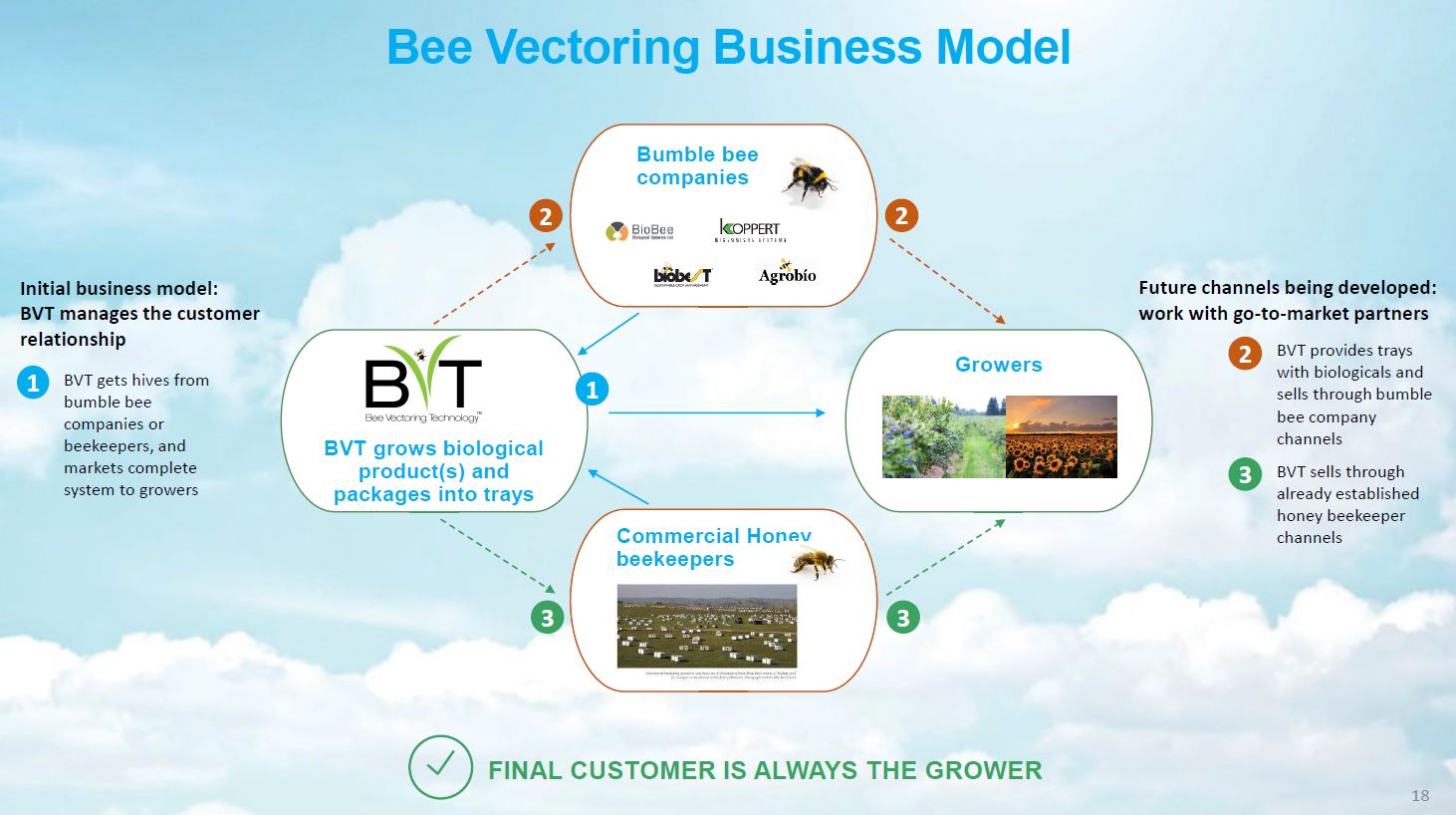 3. BVTs Wirkstoff CR-7 (hat nix mit Fußball zu tun) ist bisher das Einzige, was BVT ausbringen kann. Das System ist „Stacking“-fähig, was ich persönlich super finde und unabdingbar für einen Erfolg. Es können also auch andere Wirkstoffe für andere Krankheiten von anderen Herstellern eingebracht werden. Aber da kommt auch mein Problem: Wenn ich so ein Hersteller wäre, der ein paar Kilogramm pro Hektar über Spritzmittel verkaufen kann oder ein paar Gramm pro Hektar über Hummelverteilung, welchen Vertriebsweg würde ich dann bevorzugen? Bekommt BVT überhaupt Partnerschaften zusammen? Ich hab BVT zu der Frage schon zweimal angemailt, leider keine Antwort.