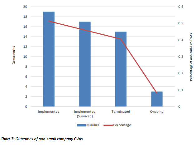 Eine Veröffentlichung aus dem Mai 2018 mit dem Titel Company Voluntary Arrangements: Evaluation Success and Failure von R3, der trade association for the UK´s insolvency, restructuring, advisory, and turnaround professionals, gibt die Mierssolgsqutoe, d.h. die intendierten Ziele wurden nicht erreicht, von CVAs mit 65,2% an (S. 24). Allerdings ist zu berücksichtigen, dass in der Gesamtanzahl von 552 Fällen 93% von Klein- und Kleinstunternehmen waren und demnach nicht repräsentativ für Großunternehmen sind. Betrachtet man nur die Großunternehmen, sind nur 40,5% erfolglos beendet worden.
