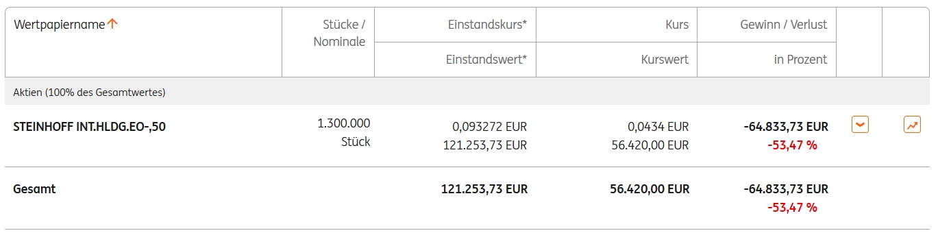 Ich bin 35 Jahre und habe vor ca. 3 1/2 Jahren angefangen mit Aktien zu handeln. Am Anfang nur mal so getradet, wenig Einsatz, wenig Gewinn. Ich hatte bzw. habe bisher noch kaum Erfahrungen mit Aktien gesammelt. Eines Tages, es war Ende Dezember 2017 glaube ich, fing ich an in Steinhoff zu investieren. Ich weiß nicht mehr weshalb, hatte nur Hoffnung, dass es wieder steigt, nachdem der Fall von knapp 4-5 Euro kam. Ich stieg glaube so bei 0,60 Euro pro Aktie ein. Damals waren es glaube so um die 10.000 Euronen. Nun ja, ihr kennt ja die Geschichte bzw. den weiteren Verfall. Ich legte kontinuierlich nach und immer wieder fiel die Aktie. Klassicher Anfängerfehler, doch die Hoffnung war groß..... Immer wieder starrte ich auf den Kurs und legte nach. Ich weiß, im Nachhinein betrachtet sehr dumm. Ich kann es nicht mehr ändern und hoffe auf einen Anstieg.