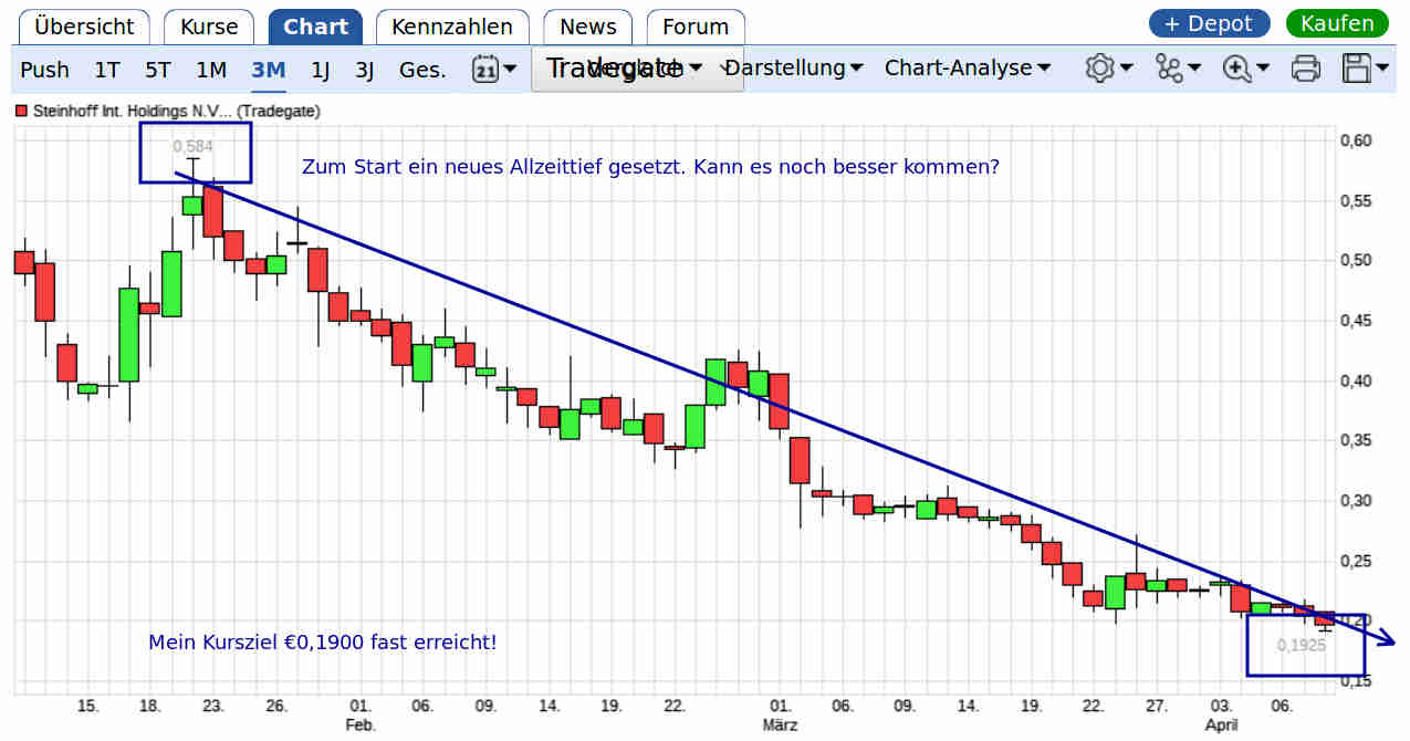 So während ich das hier schreibe erreicht Steinhoff gerade ein neues Allzeittief bei 0,190 €.