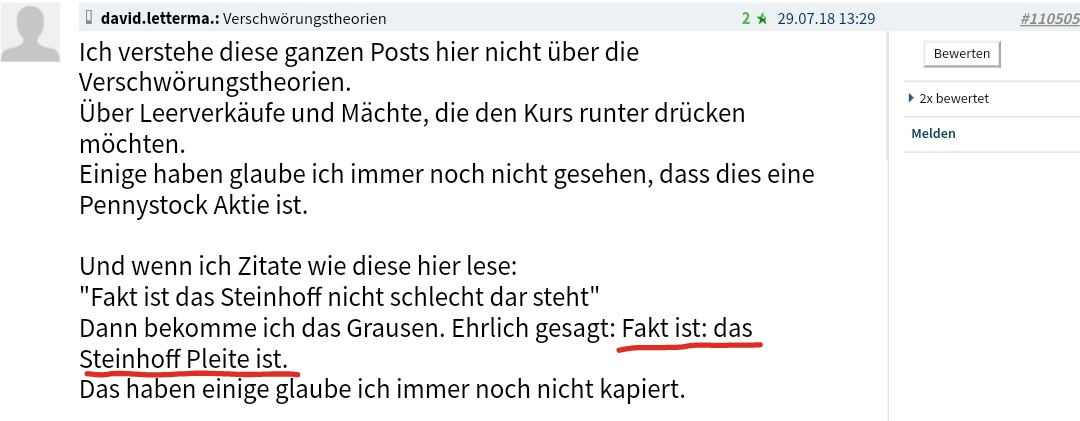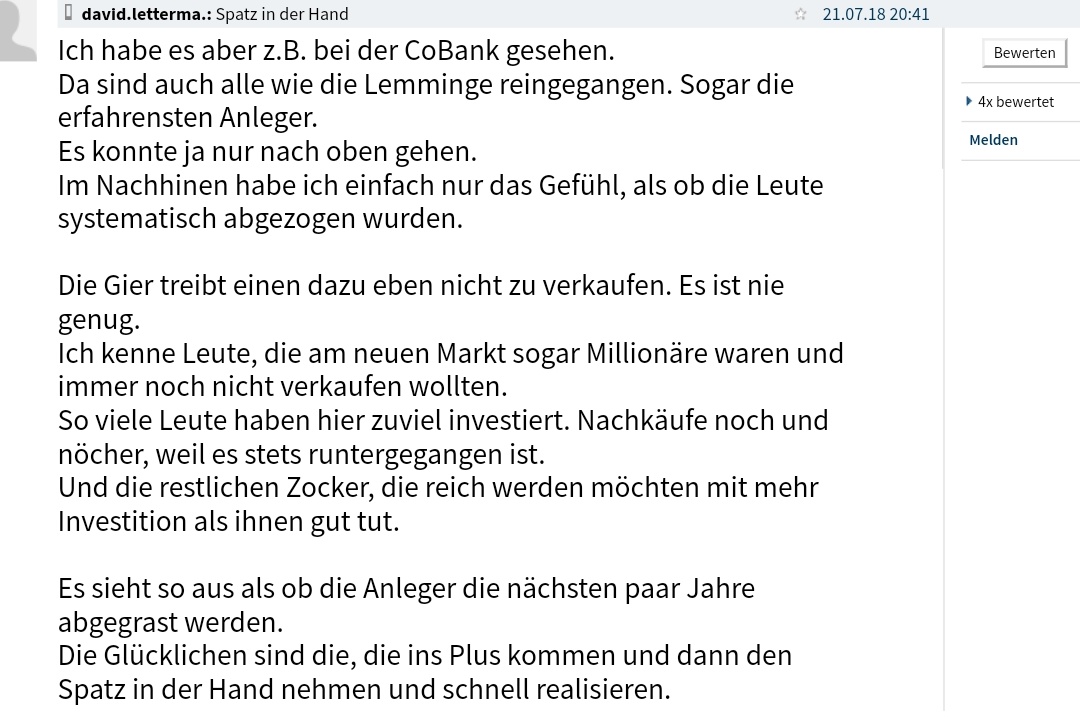 Gibt man nun den Verantwortlichen die Zeit, in diesem Fall 3 Jahre, werden wir bald eine aufgeräumte Holding sehen. Die Verantwortlichen, zusammen mit den Turnaround Experten und dem CRO, werden das Flaggschiff schon wieder auf Kurs bringen.