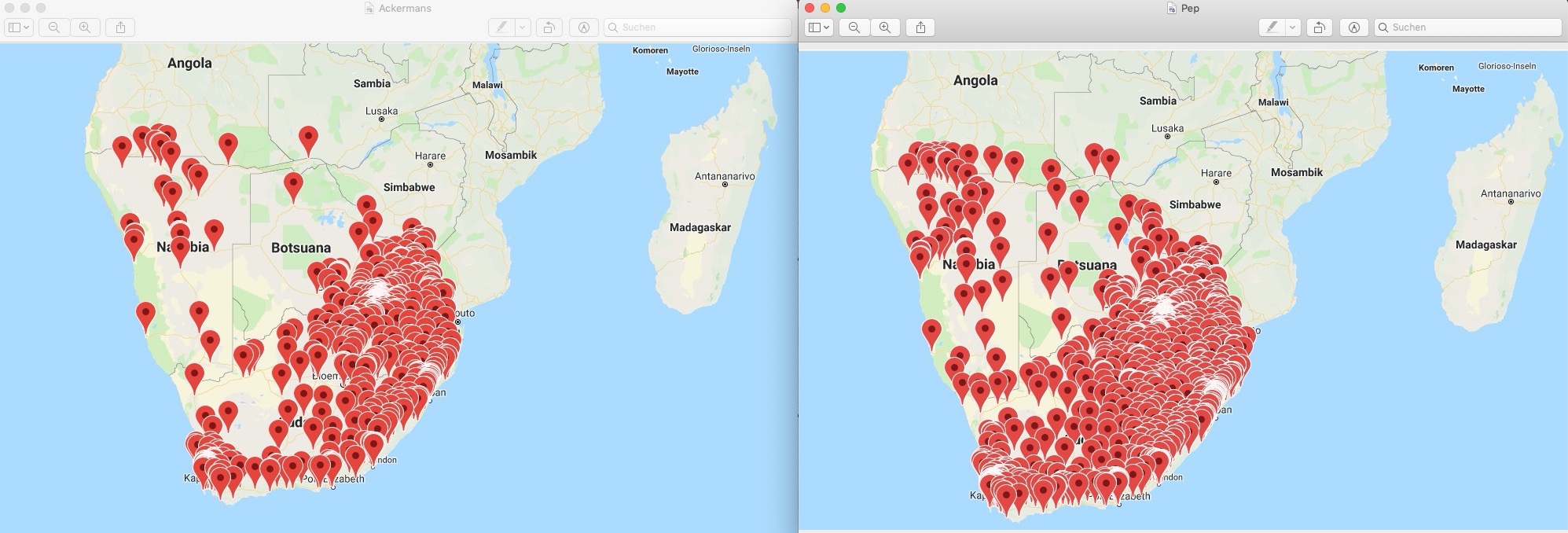 Schau mal die Verteilung von Ackermans und Pep im südl. Afrika