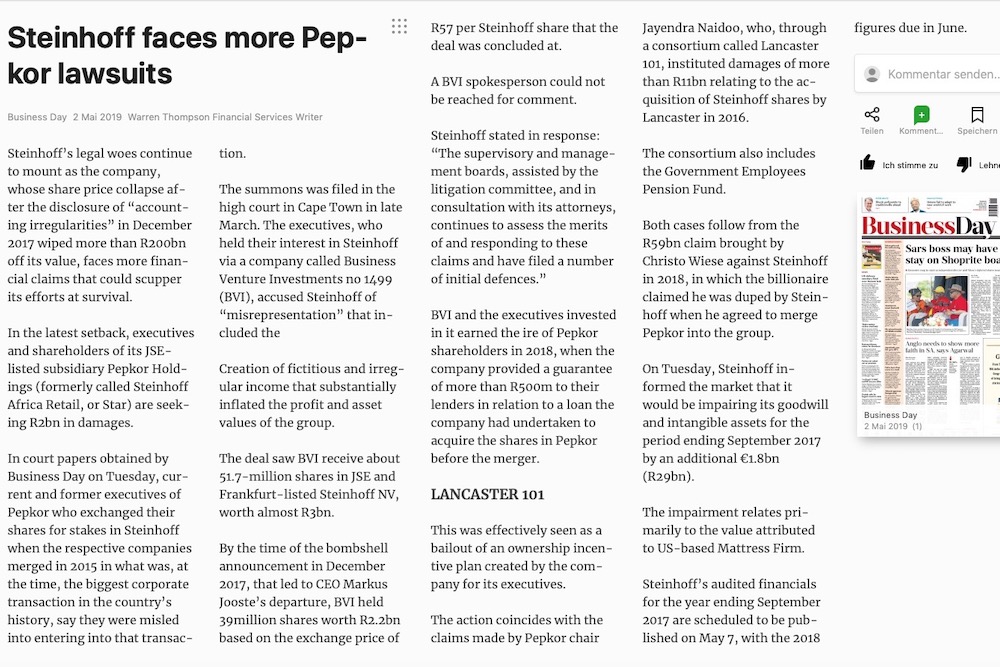 Schöner Versuch der korrupten ZA Rasselbande, die ganze Show von Pepkor wurde von den Aktionären und Gläubigern der Steinhoff international finanziert bevor die Separierung erfolgt ist, da haben die Gläubiger bestimmt auch so richtig Bock auf so eine schnuckelige Klage. ;-)