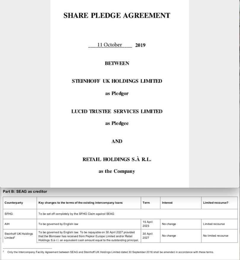 Dies würde sich aus dem von dir zitierten Share Pledge Agreement vom 11.10.2019 (SC oberer Teil) und dem im Annex 20, 2. Blatt unten, des „AMENDED AND RESTATED COMPANY VOLUNTARY ARRANGEMENT“ (SEAG12719) (SC unterer Teil) aufgeführten Intercompany Facility Agreement zw. SEAG und Steinhoff UK Holdings Ltd auch herleiten lassen.