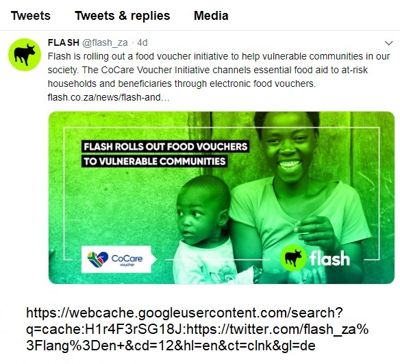 Das CoCare-Gutscheinprogramm, das Anfang dieses Monats in Ceres am Westkap erfolgreich erprobt wurde, überträgt über teilnehmende Flash-Einzelhändler und Spaza-Shops wichtige Nahrungsmittelhilfe in Form eines R150-Gutscheins an schutzbedürftige Haushalte und Begünstigte. Flash, das behauptet, ein technologiegetriebenes Unternehmen zu sein, hat nach der Ankündigung der COVID-19-Sperrung durch die Regierung einen wesentlichen Dienstleister benannt, da es einkommensschwachen Gemeinden und gefährdeten Personen ermöglicht, wichtige Dinge wie Strom zu kaufen , Sendezeit und Daten sowie Rechnungszahlungen über die 172.000 Flash-Shops, die monatlich 24 Millionen Kunden bedienen.