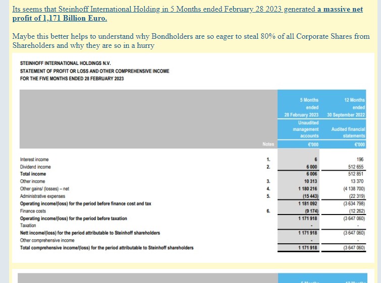 Mit Hilfe der Anwälte basteln wir nun das vom LdP zu unserer Enteignung zusammengeschusterte WHOA-Sanierungsplan zu unserem Vorteil und nach unseren Vorstellungen um und drehen damit den Spieß um. Nicht Aktionäre werden im Sanierungsplan zur Enteignung gebracht, sondern Gläubiger werden vor die Tatsache "Verzicht auf großen Teil der Forderung" gestellt. Und wenn es so klappt, gehen wir bereits nach WHOA mit 2:0 als Sieger aus diesem Krieg hervor. Denn wenn das WHOA einen Schuldenschnitt + Verlängerung der Schulden ermöglicht, bleibt für uns nur noch der Punkt offen Führungsorgane der Steinhoff so neu zu besetzen, dass sie FÜR uns Aktionäre agieren. Dann ist Steinhoff ein Selbstläufer, bei dem man sich um nichts mehr kümmern muss.