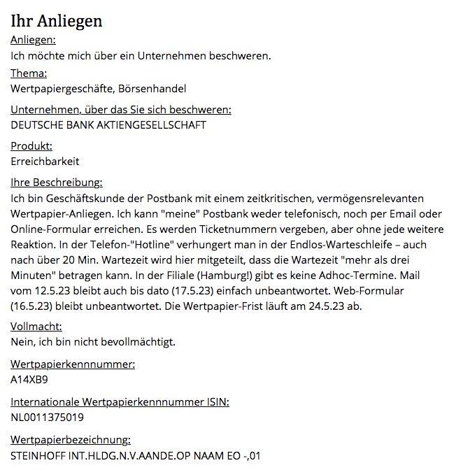 Hoffentlich irrt sich VEB total,allerdings sinkt meine Hoffnung jeden Tag mehr,da der entscheidende Druck,Sonderprüfung,Strafanzeigen gegen Management,Abwahleinleitung bzw.Androhung und öffentliche Rücktrittsforderung nicht erfolgt sind,und damit wohl das Steinhoff Management keinerlei Druck verspürt,sich zu drehen,gegen Gläubiger vorzugehen,den Aktionären etwas anzubieten,oder diese wenigstens nicht pathologisch zu bekämpfen.Record Date um einen Tag verschoben,das da keine Behörde eingeschritten ist,die Bescheinigungen auch des 9.Mai für gültig erklärt ,sagt alles,oder?