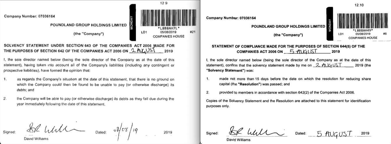 Kleines Beispiel einer Solvenz- und Konformitätserklärung nach Companies Act 2006 aus der Auflösung der Poundland Group Holdings Ltd.: