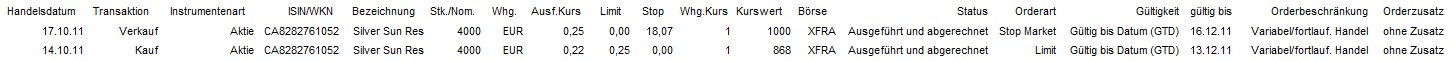 Ich habe bei einer Aktie eine Stop Market Order von € 0,18 erteilt. Obwohl der Kurs nicht unter € 0,23 fiel, wurde zu einem Kurs von € 0,25 verkauft. Wie kann das sein? Es sollte doch erst bei € 0,18 verkauft werden. Hab ich da einen Denkfehler drinnen? Vielleicht kann mir jemand auf die Sprünge helfen. Ich habe die gesamte Transaktion als JPG an mein Posting angehängt.