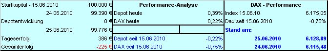 Lässt man die vergangene Woche Revue passieren, so waren die Transaktionen insgesamt erfolgreich. Die Depot-Performance war seit Beginn ab 15.06.2010 besser als diejenige des DAX. Bei den Automobilwerten konnte auch eine Transaktion mit Daimler erfolgreich abgeschlossen. Aktuell befinden sich noch zwei weitere Automobilaktien im Depot - BMW und Volkswagen VZ, für die im späten Handel noch Kaufsignale generiert wurden.