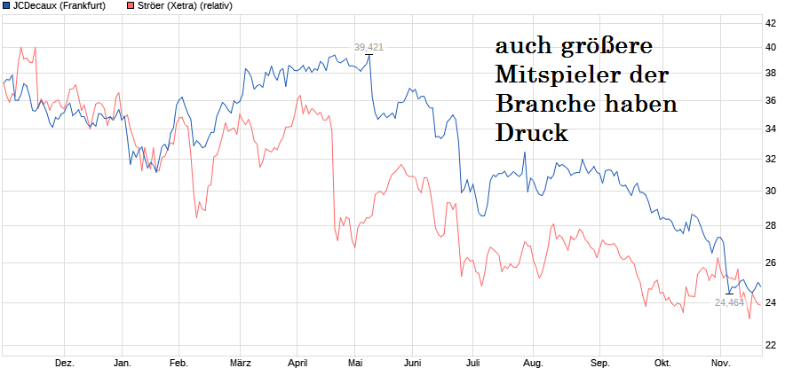 Ist defintiv auch ein Branchenproblem, wenn man sich europäische Peers anschaut wie z.B. JCDecaux ( www.wiwo.de/unternehmen/dienstleister/...sstechen/9315788.html ) und deren jüngste Zahlen bzw. die Reaktion darauf. Daran messen auch instit. Anleger, ob sie in diese spezielle Branche mehr investieren sollen oder nicht. Daher nicht zu enge Scheuklappen aufsetzen und sich einreden nur die LV wären alleine Schuld. Ruhig mal als mündiger Mensch auch aktiv eigenständig der Blick über den Tellerrand wagen anstatt passiv nachplaudern. Gibt genug Werte wo auch massiv LV eingestiegen waren und es trotzdem nicht viel später wieder nach oben ging, weil einfach die instit. Anleger in hinreichender Zahl die Kurs für interessant hielten. Die Finanzkraft der LV ist ja gemessen an der billionenstarken Kapitalkraft der inst. Fonds die Long gehen als Krümmel anzusehen. Wenn die Longseite wirklich Lust auf einen Wert hat, dann hält die kein LV nachhaltig auf. Auch eine Wirecard hat es doch inzwischen solide geschafft sich deutlich wieder aus dem Keller zu arbeiten in dem man nach der Rufmord-Attacke war. Nur Ströer hat offenbar bislang nicht genug Long-Investoren wieder überzeugen können bzw. ist in einer Branche unterwegs die nicht gerade als "hot" angesehen wird und die bei Branchenrotationen (wie z.B. zuletzt von ImmoWerten hin zu Bankenwerten) nicht wieder mit ins Spiel bislang kam.