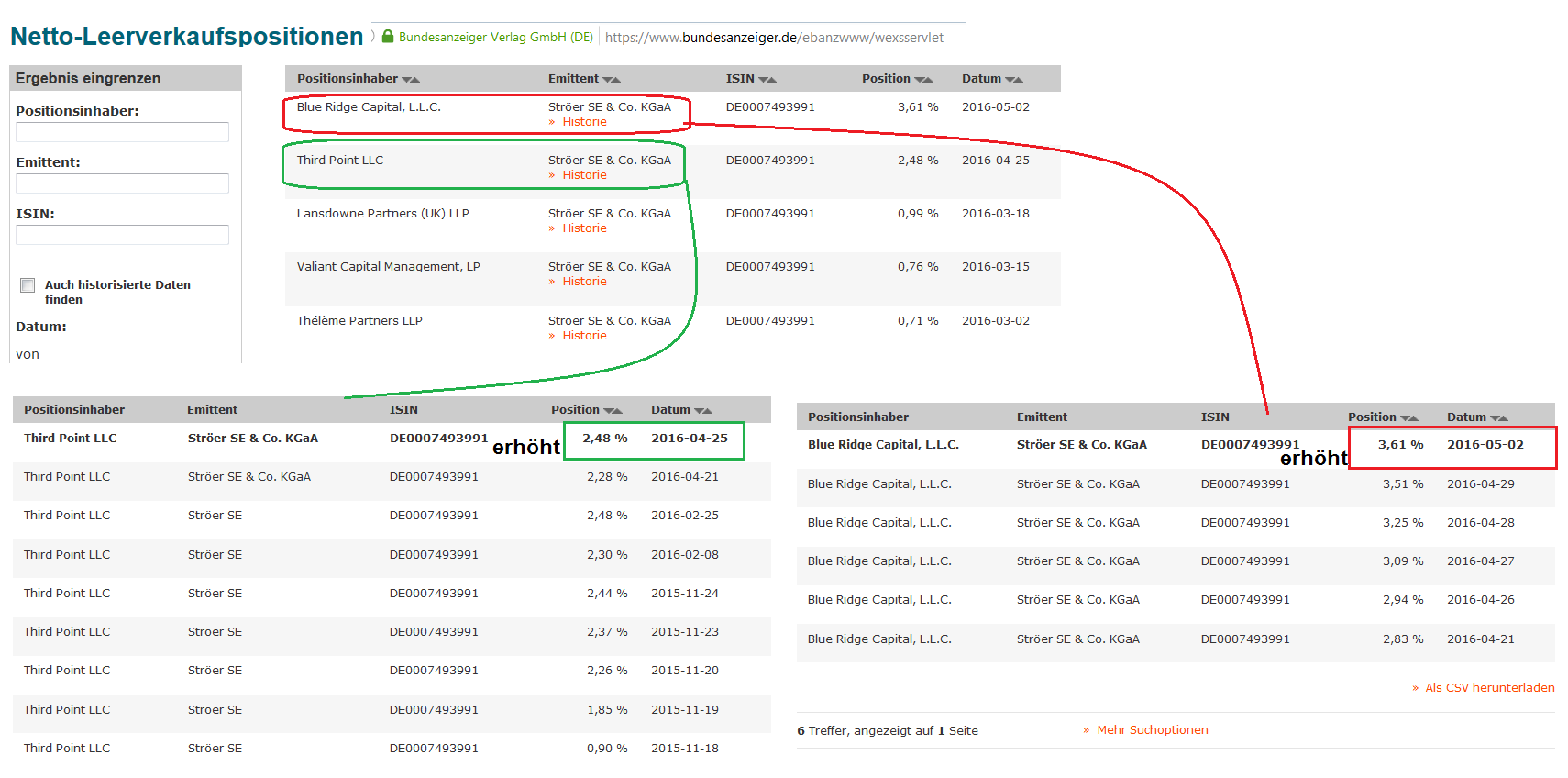 Der Bundesanzeiger zeigt Über-/Unterschreitungen von 0,5% öffentlich an und wenn jemand nach Überschreitung der 0,5% weiter agiert. Was weiter passiert, wenn jemand z.B. unter die Meldeschwelle 0,5% geht ( bleibt man knapp darunter? Baut man bis 0% ab? ) wird dann nicht mehr für alle ersichtlich. Intern muß noch weiter an die BaFin gemeldet werden, wenn 0,2% über-/unterschritten werden. Bekommen wir einfachen Leute aber nicht zu sehen. Du kannst im Bundesanzeiger anschauen wie die Historie ist der jeweiligen Leerverkäufer die gegenwärtig meldepflichtig sind. (>0,5%). Zuletzt hat es keine Anzeige von Reduzierungen gegeben, sondern es wurden die Leerverkaufpositionen weiter ausgebaut. Zumindest von Playern die sich über 0,5% bewegen. Von daher scheinen gewisse Herrschaften weiter darauf zu wetten, daß es nochmals größere Rücksetzter gibt. Wenn es aber andersrum laufen sollte, dann würden die irgendwann in den Enge getrieben und ein Squeeze wäre möglich.