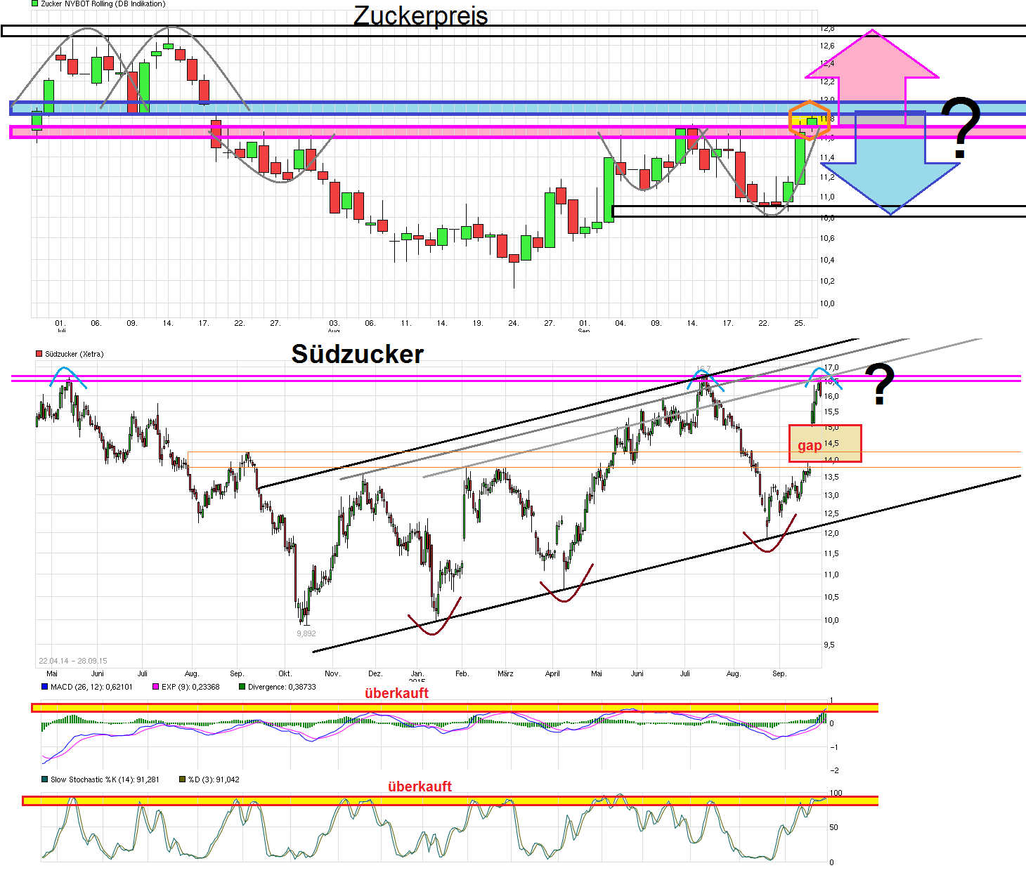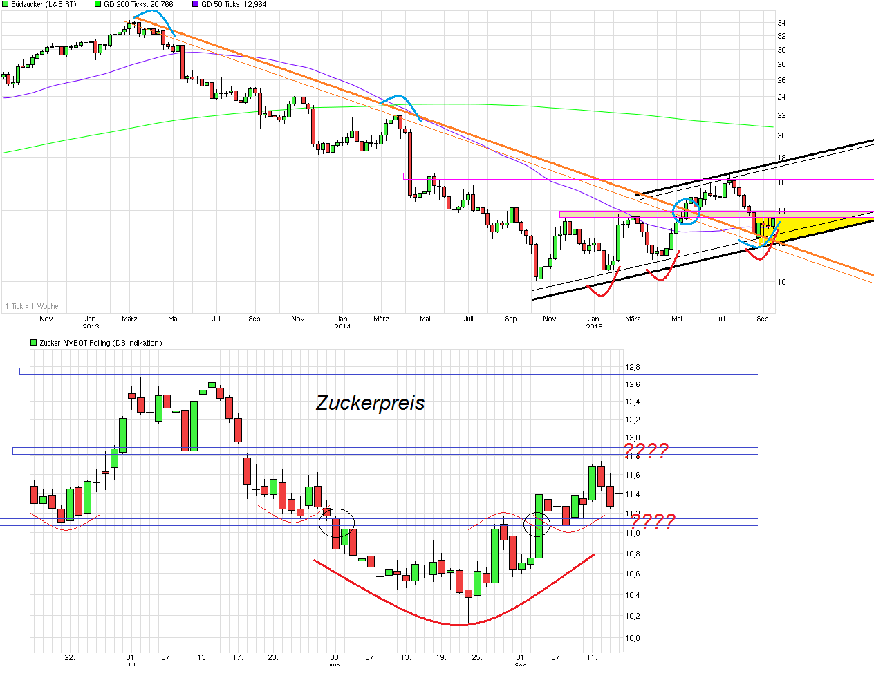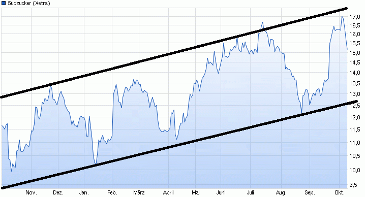 Da haben wohl Shorties darauf gewettet, daß man nicht über die Region um die 14,10/20 zurückläuft und wurden ausgestoppt. Hat sich aber schon die letzten Tage gezeigt, daß Südzucker sich im schwachen Gesamtmarkt weiter festgehalten hat. Allerdings sind die Aussagen von Südzucker überhaupt nichts Neues für jemandem der parallel den Zucker- und Ethanolpreis verfolgt ( was ja kinderleicht jeder kann). Daher spielen auch sicher einige Instis und deren Analysten vielleicht jetzt auch nur den positiv überraschten Ahnungslosen ;) Insofern muß man mal abwarten wie weit der heutige Sprung tragen kann und ob das Gap nicht bald auch wieder geschlossen wird im Zuge eines Pullbacks an die Ausbruchmarke. Denn die Zuckerpreise sind zwar in den letzten Wochen vom Rekordtief aus wieder ein kleines Stück gestiegen, aber die letzten Tage wieder klar gefallen und weiterhin noch garnicht so weit entfernt von den Tiefstständen. Da muß man jetzt mal schauen, wie das Wetter die anstehende Ernte in Indien und Brasilien weiter beeinflußt ( wo bei gutem Wetter eine deutliche Überproduktion anstünde) und ob die großen Schadensersatzklagen von Nestle&Co. ( Klagewelle rollt auf Südzucker zu - www.morgenweb.de/nachrichten/wirtschaft/...zucker-zu-1.2382981 ) die Südzucker noch zusätzlich am Hals hat und die richtig kostspielig werden könnten, nicht auch etwas als Euphoriebremse noch wirken werden