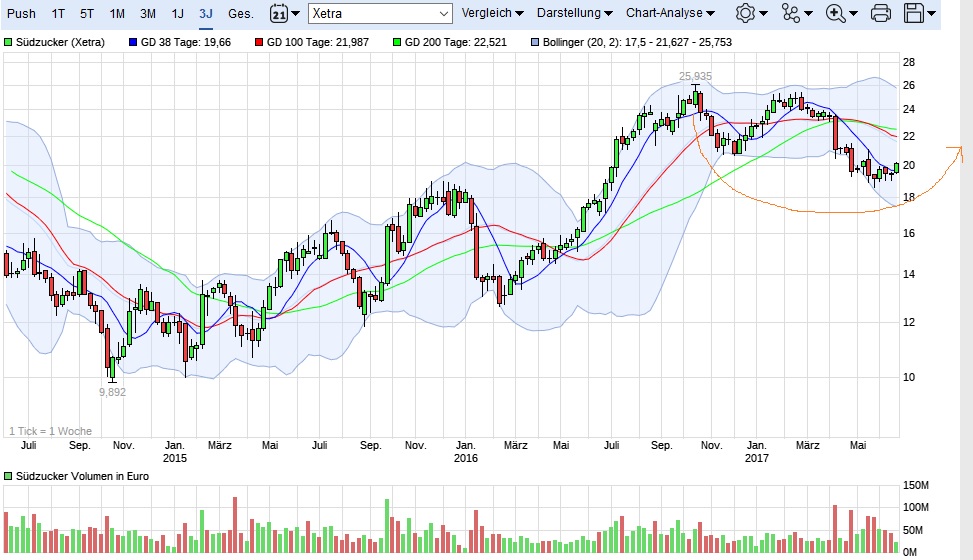 Ich bin jetzt auch bei Südzucker zu 18,95 eingestiegen, nachdem ich Agrana (SZ-Tochter) schon seit 2 Jahren zu ca. 80,- und seit Febr. 17 (Kap.-Erh. 100,-) als Langfristanleger (hohe Div.-Rendite) kaufte.
