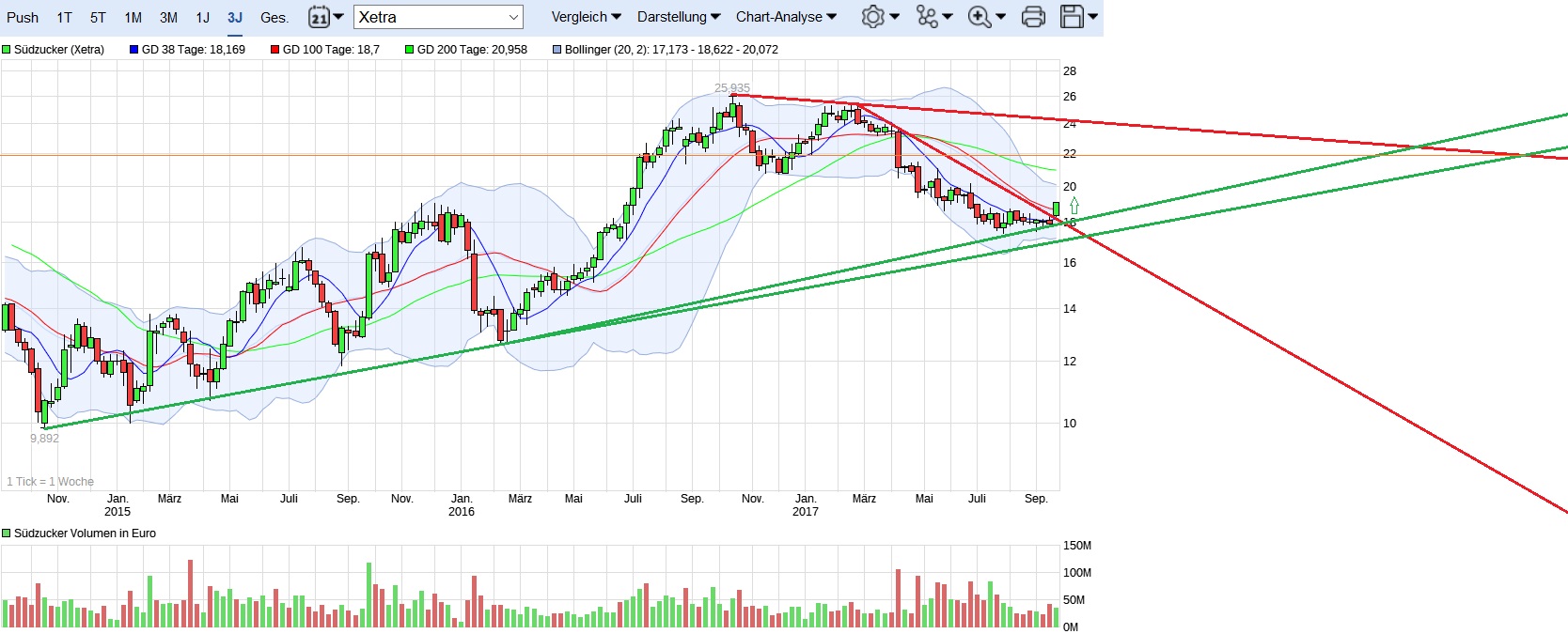 Aktuell wird ein neues Sprungbrett für höhere Notierungen geschaffen. Seit zwei Tagen kämpfen Bullen und Bären in Südzucker um die Vormachtstellung. Viel spricht für den Ausbruch nach oben. Vergangenheit mit guten Q-Ergebnissen, Gegenwart mit Momentum durch Bodenbildung und signifikanten Anstieg nach guten Ausblick des Vorstandes am vergangenem Wochenende. Zukunft, weil Südzucker seine Hausaufgaben gut gemacht hat und den asiatischen Markt mit dem afrikanischen erobern möchte und 2-3fachen Umsatz in Aussicht stellt. Wer Südzucker analysiert hat und zu gegenteiligen Ansichten kommt, bitte ich mich zu korrigieren. Ich bin hier mit sehr hohem Volumen seit mehreren Wochen mit Spekulation auf eine Trendwende eingestiegen und kann nicht erkennen, welche Faktoren den Kurs nochmal unter 18 tragen könnte. Selbst bei einem Rückgang des Gesamtmarktes sollten Gelder von Unternehmen mit guten Gewinnen in die zurückgebliebenen mit guten Aussichten umgeschichtet werden. Ich sehe hier nur ein Rückgang wenn ein sogenannter schwarzer Schwan für das Unternehmen vorliegen könnte. Da fehlt mir aber die Phantasie, welches das sein könnte.