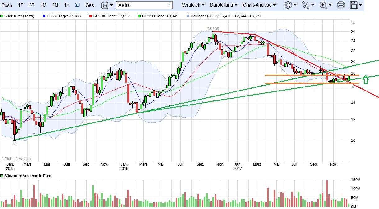 Für Südzucker-Aktionäre neigt sich ein sehr schweres Jahr 2017 dem Ende. Zum Jahreswechsel 2016/17 notierte die Aktie noch im Bereich von über 20 EUR und konnte sogar noch bis auf ein Jahreshoch bei 25,39 EUR Mitte/Ende Februar ansteigen. Von diesen Kursen ist man mit aktuellen Notierungen unterhalb von 18 EUR aber weit entfernt. Damit dürfte klar sein, wer in 2017 größtenteils das Sagen hatte.