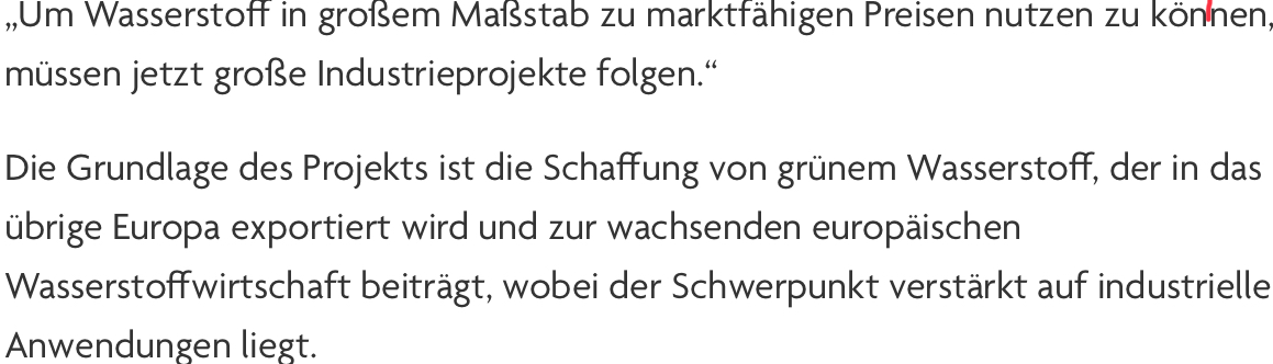 Die Grundlage des Projekts ist die Erzeugung von grünem Wasserstoff, der in den Rest Europas exportiert werden soll, um einen Beitrag zur wachsenden europäischen Wasserstoffwirtschaft mit einem verstärkten Fokus auf die industrielle Anwendung zu leisten.