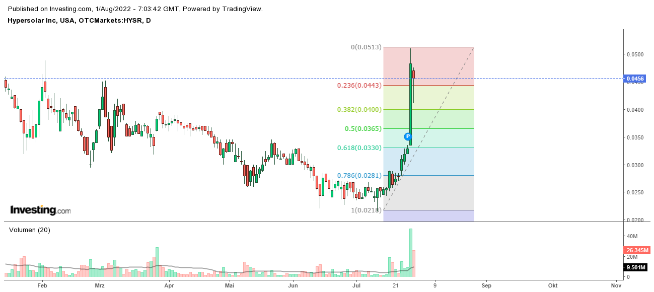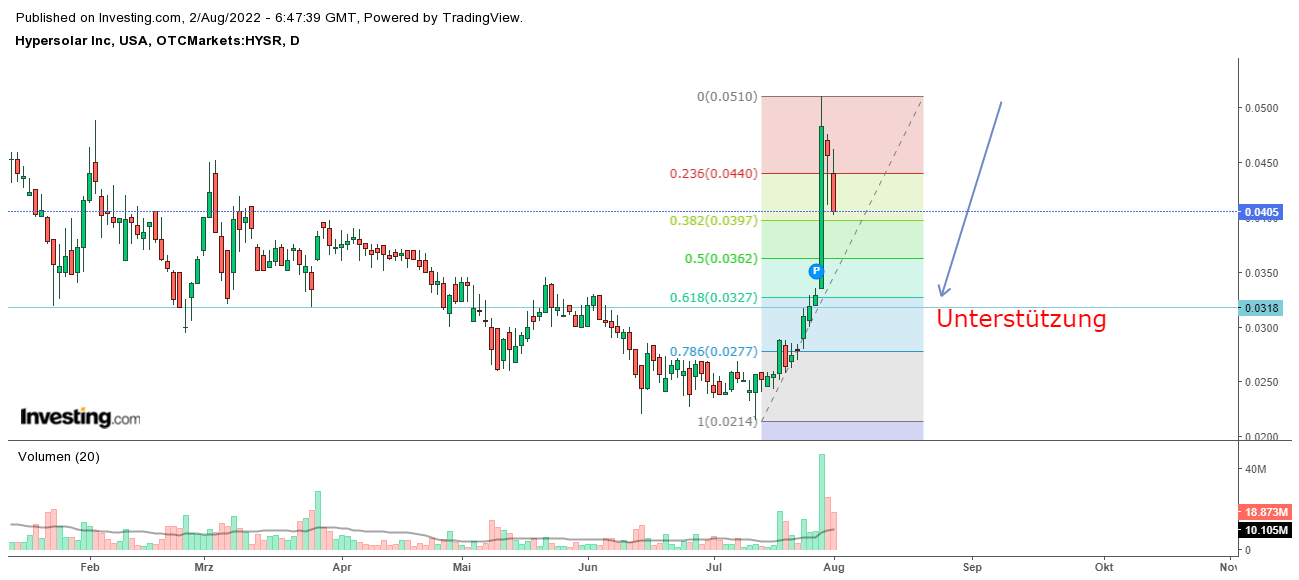 Guten morgen, meiner Meinung nach ist die Aktie der Zeit stark überkauft. In Dollar hat sich ein "Hangingman" ausgebildet. (steht für Trendumkehr) Nach Fibbonacci könnten wir bis in den Bereich 0,03$ korrigieren.