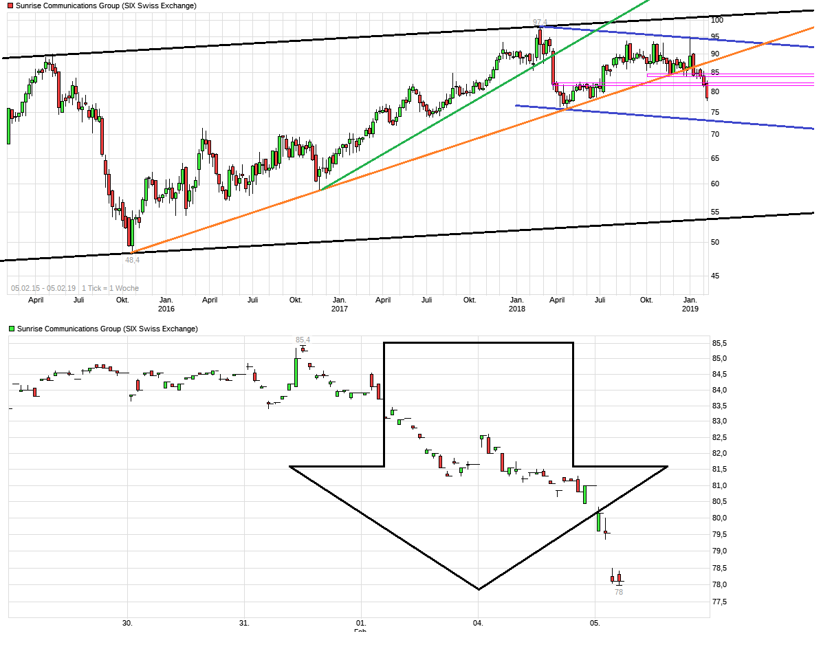Somit hat sich das jüngste Gerücht über einen neuen 4. Mitspieler im schweizer 5G Markt erledigt. Da war ja Vodafone als möglicher Mitbieter im Gespräch. Das wäre erstmal positiv für die Kurse der etablierten Betreiber. Bleibt halt noch als Belastung die Geschichte mit der möglichen Übernahme von UPC durch Sunrise. Da hat man inzwischen bestätigt, daß man sich darüber wirklich unterhält. Wenn die kleinere Sunrise die gewichtigere UPC schlucken will, dann wird das extreme Mittelzufuhr erfordern mit KE und Schuldenaufnahmen. Und natürlich muß man für einen Übernahmekandidat noch einen strategischen Aufpreis zahlen. Alles also Dinge die erstmal den Käufer belasten und dessen künftige Divis negativ beeinfussen dürften. Entsprechend ist also der Sunrise Kurs wohl erstmal weiter eine Weile gedrückt solange diese Geschichte nicht in die eine oder andere Richtung entschieden ist. Und wenn Sunrise nicht mehr selber übernommen wird, dann ist hier die Übernahmephantasie aus dem Sunrise-Kurs raus, der ja zuvor lange den Sunrise-Kurs zusätzlich angeschoben hatte. Also abwarten wie es da weitergeht. Gehalten hat jetzt erstmal weiter die horizontale Unterstützung von 76,10 schweizer Franken. Wäre gut man bleibt darüber, da sonst wohl wieder eine SL Welle ausgelöst werden könnte.