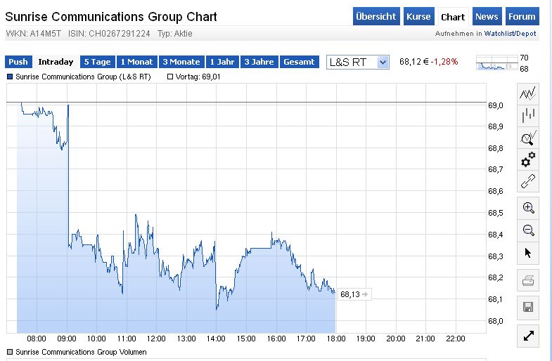 Angesichts dieser Ausgereiztheit beim Sunrise-Kurs verkaufe ich jetzt meine Sunrise-Aktien. Kann natürlich nicht ausgeschlossen werden, daß UPC / Liberty Global nochmal im kommenden Jahr ein weiteres verbessertes Angebot macht für die Aktionäre die jetzt noch nicht abgeben. Aber schwer zu sagen ob und wann es so kommt oder welche mögliche Höhe es haben könnte. Von daher jetzt schonmal mal den fetten Spatz in der Hand mitnehmen und reinvestieren in Werte die vielleicht in der nächsten Zeit noch mehr Dynamik nach oben haben könnten beim Kurs als eine Sunrise die schon sehr nahe an der 110 Franken Marke notiert.