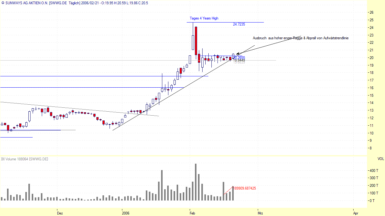 Im Tageschart wurde am 21.02.06 eine hohe enge Flagge nach oben hin verlassen, die Aktie sollte jetzt zunächst das Tages 4 Jahres Hoch testen. Bei Durchbruch sollte Sunways zügig Richtung 32€ marschieren.