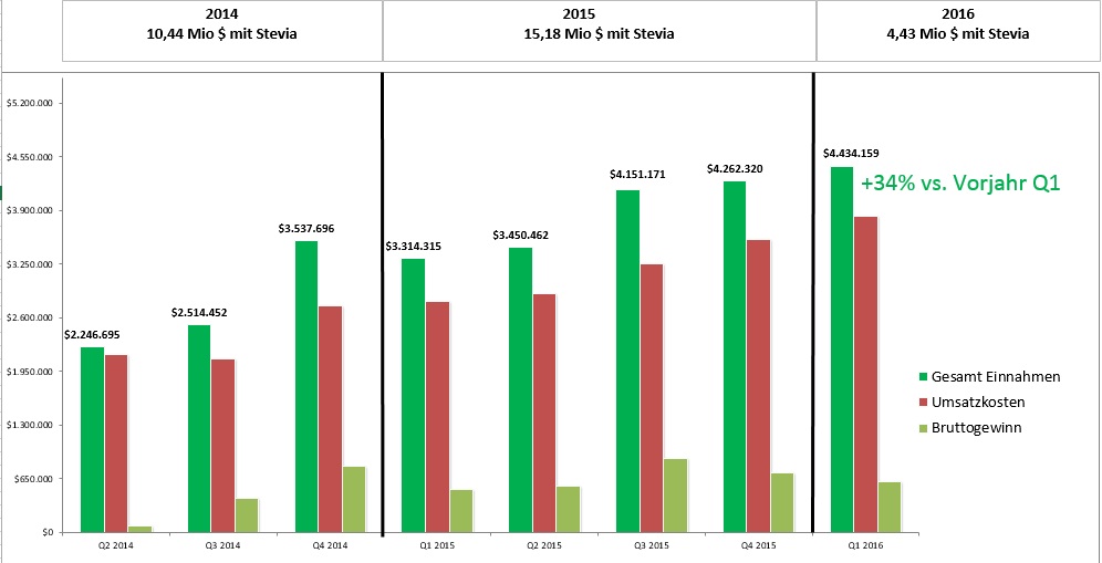 Das Wachstum im Stevia Segment zeigt seit 2 Jahren eine unglaubliche Welteroberung. Von ehemals 10,44 Mio $ Umsatz in 2014 auf 15,18 $ in 2015 konnte Sunwin die richtige Richtung zeigen. Wir dürfen uns auf das Jahr 2016 freuen wo wir bereits im Q1 mit unglaublichen 4,4 Mio $ als Start alle Weilchen gelegt haben um erneut mit einem zweistelligen Umsatzwachstum den Erfolg der Stevia Pflanze zu beweisen.