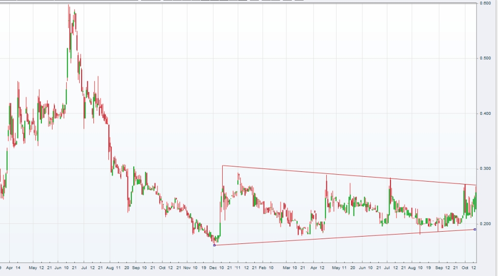 Seit dem Hoch (17.06.2010) bildet sich ein „Bärischer-Wimpel“ aus, der in Kürze (4-6 Wochen) nach unten ausbrechen wird, was für einen starken Abgabedruck sorgen wird. Eine Erholung bis 0,27-0,28 ist dazu kein Widerspruch.