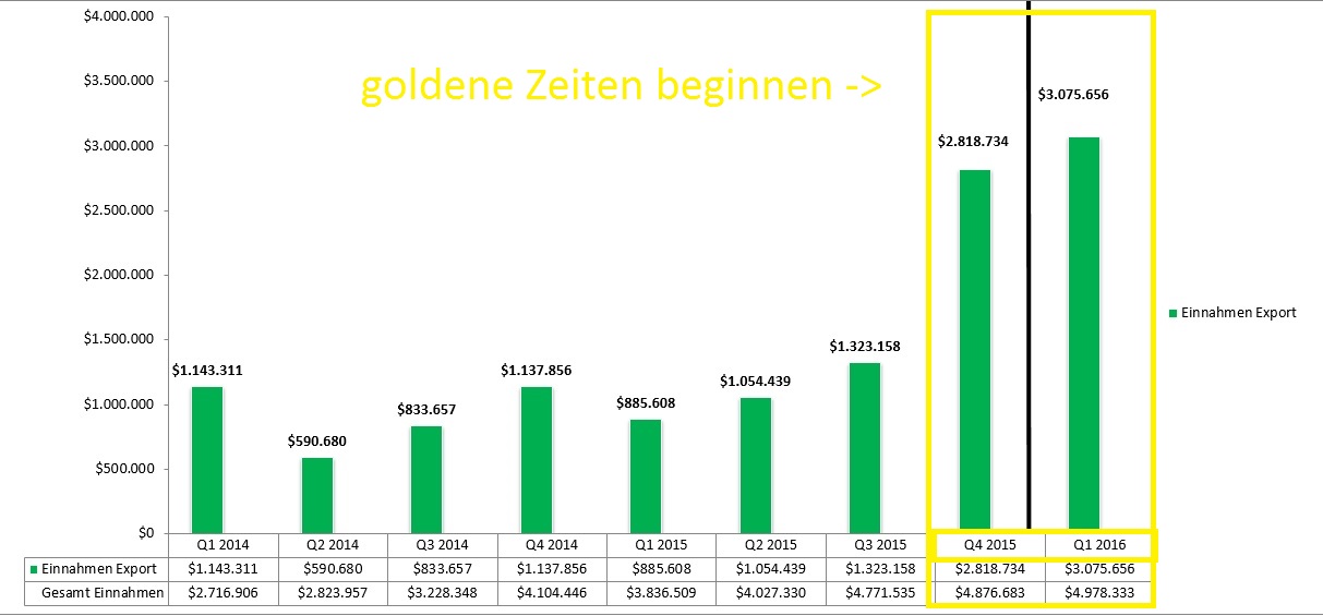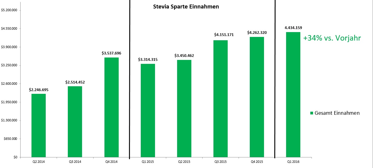 4,4 Mio Stevia-Umsatz hatten wir nun im Q1. Da bleibt so einiges für die kommenden 3 Quartale. Konkreter: 7 Mio pro Quartal. Oder, wenn die Anlage erst ab dem Q3 läuft, im Q2 nochmals ca. 4,4 Mio, und ab Q3 dann über 8 Mio Umsatz pro Quartal. Der implizite Ausblick ist sehr positiv. :-)
