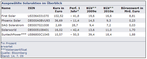 Hinzu kommt, dass insbesondere europäische und amerikanische Fotovoltaikfirmen unter der schwierigen Situation am Kreditmarkt leiden. Fremdkapital ist rar mit der Folge, dass es zunehmend zu Finanzierungsengpässen oder zu Streichungen von Großprojekten kommt. Außerdem wurden in Schlüsselmärkten wie Deutschland die Einspeisevergütungen reduziert oder wie in Spanien das Förderbudget zusammengestrichen. SES-Experte von Blumenthal rechnet daher mit keiner schnellen Erholung des Sektors. Er rät insbesondere von Aktieninvestitionen in kleinere Produzenten ab.