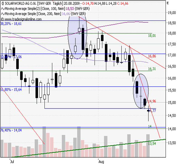 Spannend wurde es noch einmal zu Wochenbeginn. Am Dienstag bildete sich ein Doji aus. Einige Marktakteure spekuliert hier sicherlich auf eine weiße Kerze am Mittwoch und damit auf eine Morning Doji Star-Formation, die bullish zu interpretieren wäre (allerdings fehlte das idealtypische Gap). Zudem lag auf dem Niveau des Tagestiefs vom Doji eine schwache Unterstützung (Intradaytief vom 14. Juli). Die Entwicklung am Donnerstag verdeutlichte aber erneut das derzeit negative Sentiment für die Solarworld-Aktie (und damit auch zu einem Großteil für die gesamte Solarbranche): Die Aktie eröffnete sogar unter dem Verlaufstief vom Juli und bildete ein Tagestief bei 14,28 Euro aus. Seit dem 13. August hat die Aktie in der Spitze bereits knapp 20 Prozent an Wert verloren. In den kommenden Tagen drohen der Aktie im ungünstigsten Fall aber noch wesentlich herbere Verluste.