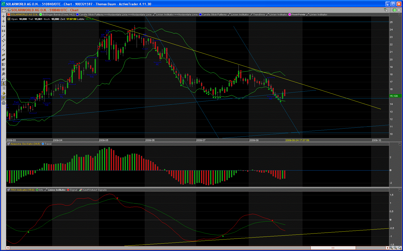 Unser im letzten Update veranschlagtes Kursziel von 30 Euro auf Sicht bis Ende 2010 ist weiterhin möglich und realistisch. Derzeit halten wir den Kurs für attraktiv. Interessierte müssen sich allerdings auf weitere maue Nachrichten in den kommenden Monaten einstellen, denn eine Bereinigung der Überkapazitäten in dieser Branche wird (für viele Unternehmen) schmerzhaft und zäh werden. SolarWorld sollte zu den Gewinnern zählen, kurzfristig wird jedoch Geduld gefragt sein.