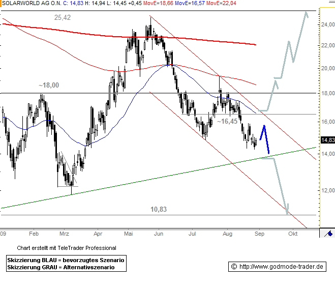Der laufende Abwärtstrend dürfte sich unterhalb von 13,75 Euro dynamisch weiter fortsetzen. Eine Verkaufswelle bis auf 10,83 Euro ist dann zu erwarten.