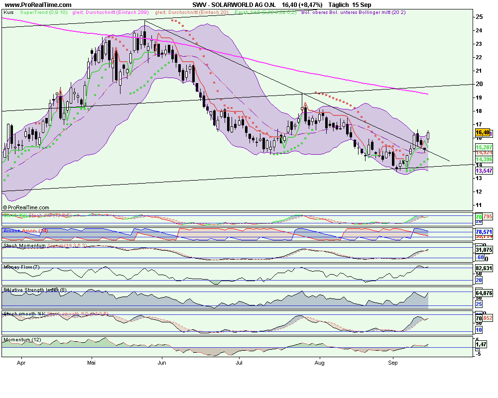 16.09.2009 - Bereits in der vergangenen Woche versuchte sich die Aktie von Solarworld an einem Ausbruch über die Widerstandszone bei 16,33/16,68 Euro – und scheiterte an zwei Tagen. Es folgte ein Rückschlag auf 14,89 Euro, wo das Papier drehte und damit die Unterstützung oberhalb von 14,77 Euro bestätigte. Am Dienstag gelang dem Papier mit einem Aufwärtsgap der Sprung zurück in den Widerstandsbereich unterhalb von 16,68 Euro.