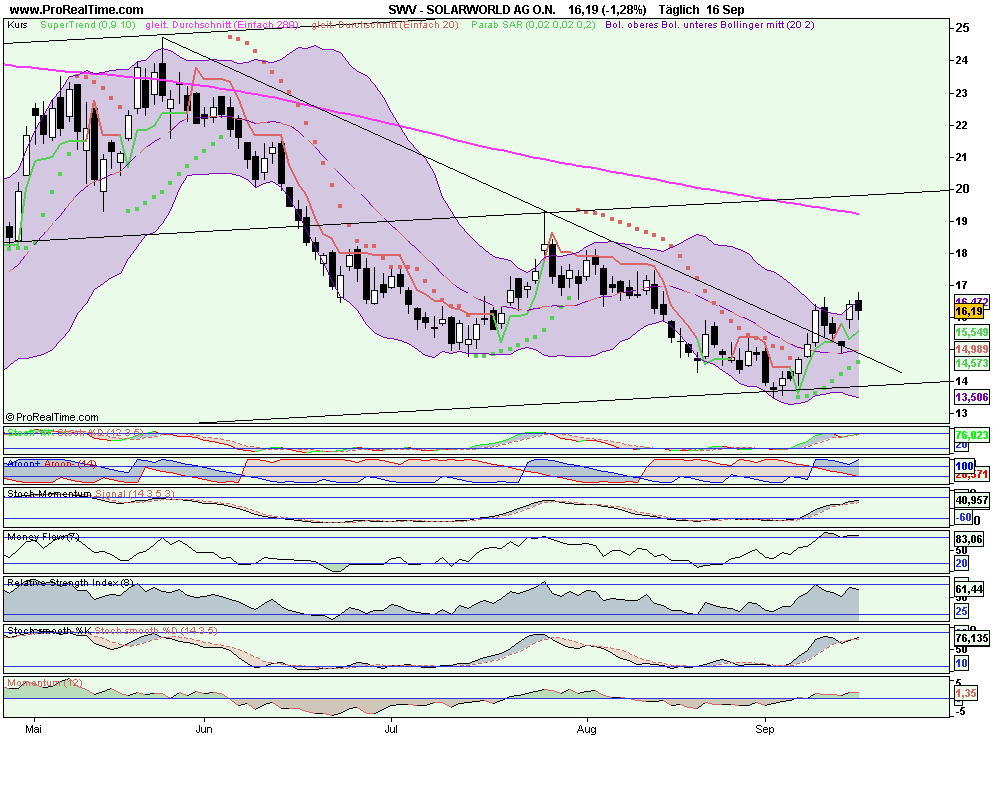 Derzeit läuft bei Solarworld im technischen Bereich noch viel auf sehr kurzfristiger Tradingbasis mit geringen Gewinnspannen, wie die folgenden Chartmarken zeigen werden. Nach oben hin ist ein Ausbruch über 16,33/16,68 weiter möglich, mit 16,19 Euro hat Solarworld gestern nur knapp unter dem Widerstand geschlossen. Wird die Zone überwunden, so liegt weiterhin bei 17,45 Euro die nächste Hürde, die Ende der ersten Ausgusthälfte entstanden ist. Nach unten hin sollte ein Augenmerk auf den Bereich 15,34/15,64 Euro gerichtet werden, der als Unterstützung fungieren könnte. Wird diese Zone unterschritten, kommt 14,77 Euro in den Blick.