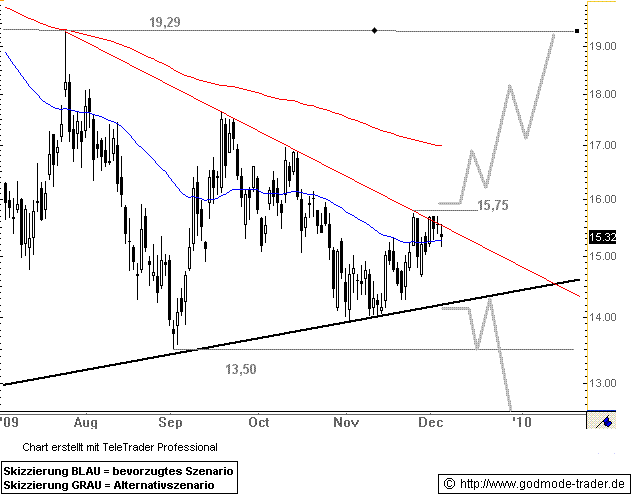 Wie bei den Analysten hat sich auch in der Charttechnik noch kein eindeutiger Trend herausgebildet. Der eingezeichnete mittelfristige Abwärtstrend sowie die 90-Tage-Linie wurden zwar leicht aber noch nicht entscheidend überwunden. Der kurzfristige Aufwärtstrend ist hingegen intakt. Das charttechnische Bild hat sich merklich gebessert. Von einer überzeugenden Trendwende kann man jedoch erst sprechen wenn die Aktie bei nennenswerten Umsätzen die 16-Euro-Marke knackt.