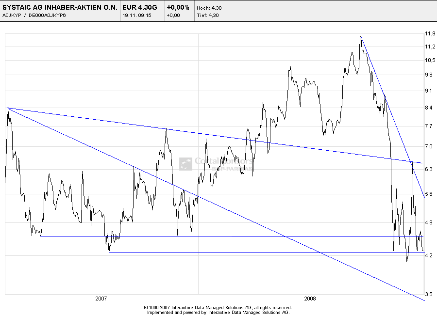 Langsam habe ich vom gesamten Aktienmarkt so die Schnauze voll, dass ich aufhören werde Kurse oder Indizes zu verfolgen. Meine 1.500 Aktien von Systaic bleiben schön im Depot liegen, bis Sie wertlos ausgebucht werden, oder ich sie zu einem Preis von über € 10,00 verkaufen kann. Auch wenn dies erst in 39,5 Jahren der Fall sein wird :)