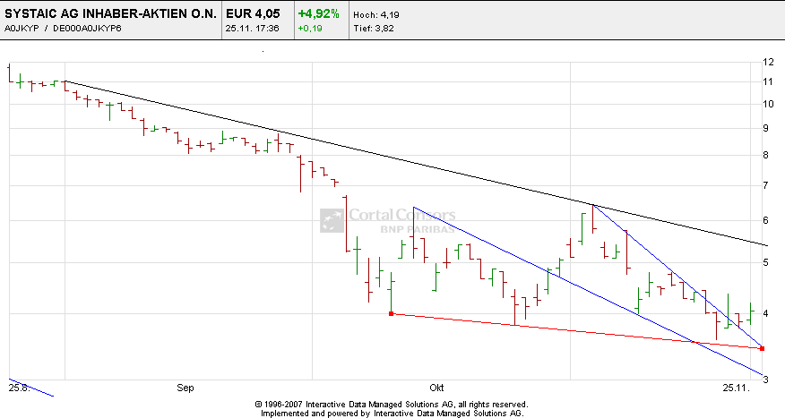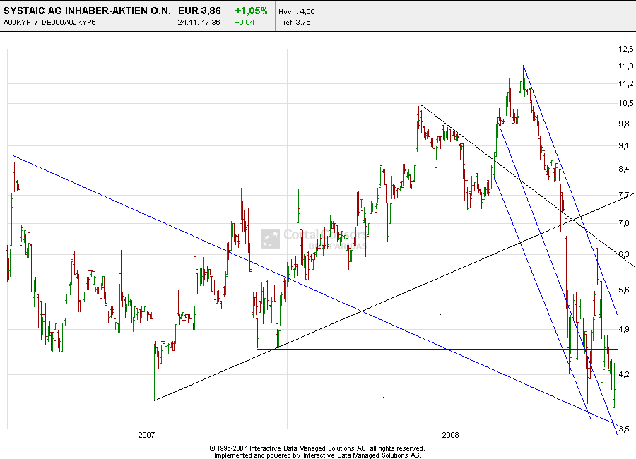 Die Frage nach der Erholung von Systaic stell ich mir seit einem viertel Jahr. Die Tendenz geht leider, seit den Höchstkursen im Sommer, steil nach unten. Ich hätte mir auch erhofft, dass Systaic gegenüber der Finanzkrise robuster ist. Aber ist voll in den Abwärstsstrudel mithineingezogen worden. Und das Image, eine ewige kleine ,,Klitsche" zu sein, hat Systaic auch nicht abschütteln können. Was glaubst du Griper, wie oft ich schon an einen Verkauf von Systaic gedacht habe. Aber hab mir immer eingerdet, dass es schlimmer nicht kommen kann und dass ich jetzt mal bei einer Aktie bleibe und sie nicht mit Verlust verkaufe. Weiss auch nicht wie es jetzt mit Systaic weiter geht. Aber ich hab jetzt mittlerweile schon so viel mieße gemacht mit Systaic, dass es nichts bringt sie jetzt zu verkaufen, um dann eventuell eine andere Aktie zu kaufen. Das Problem ist nämlich, was für eine Aktie du anstelle von Systaic kaufen willst??
